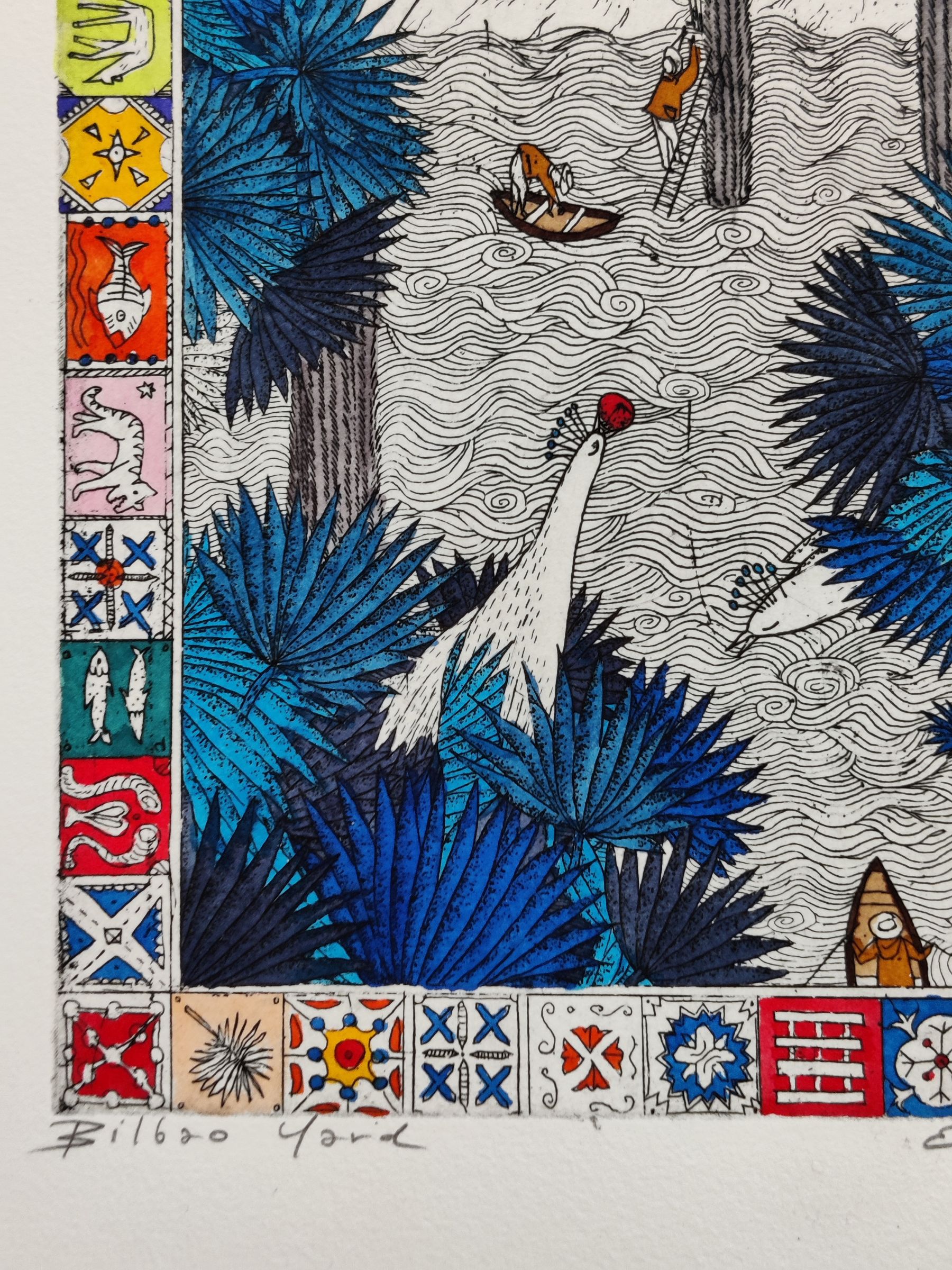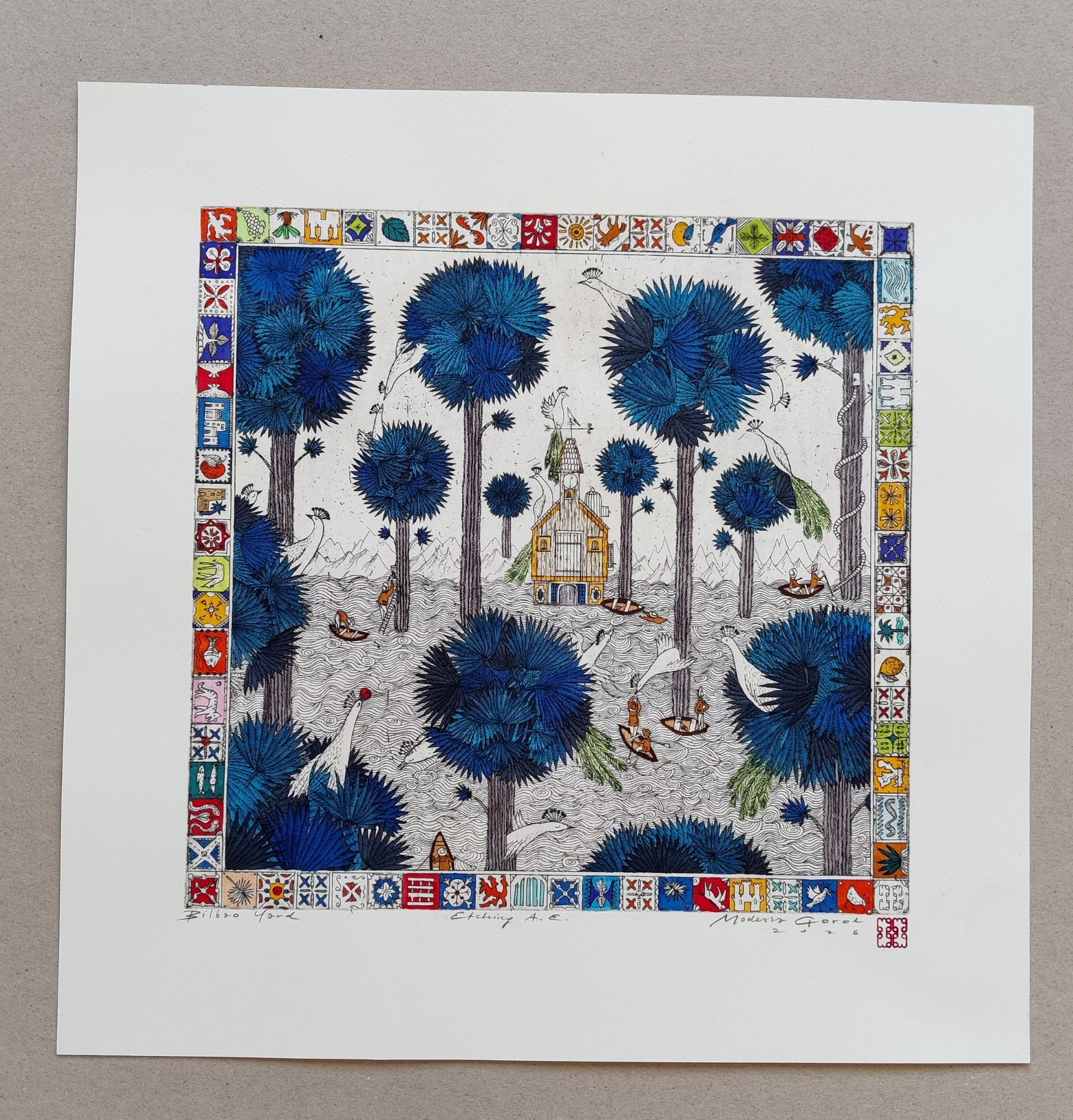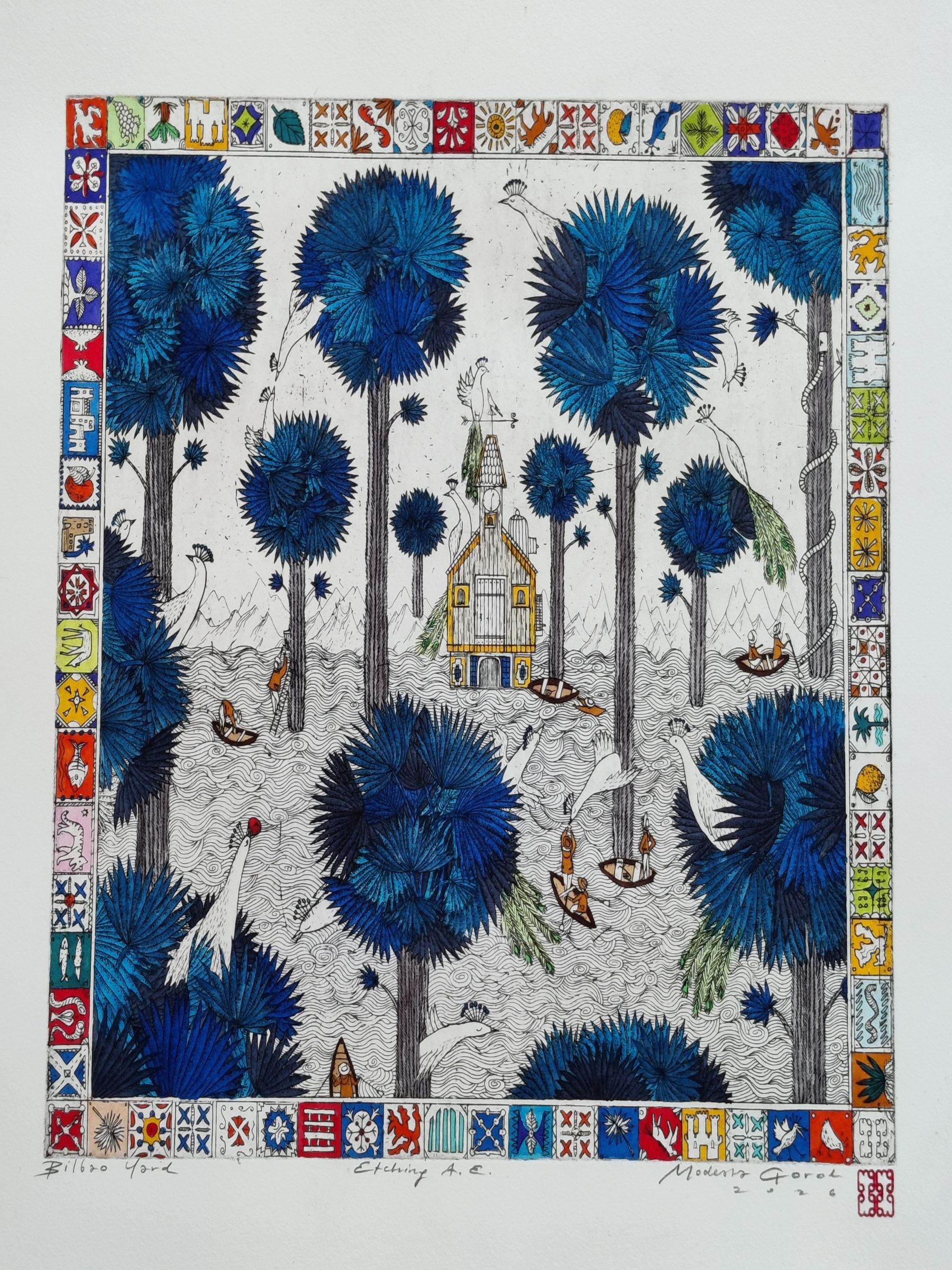 Grafika wykonana w technice akwaforty na papierze z dodatkiem akwareli. Odbitka autorska.