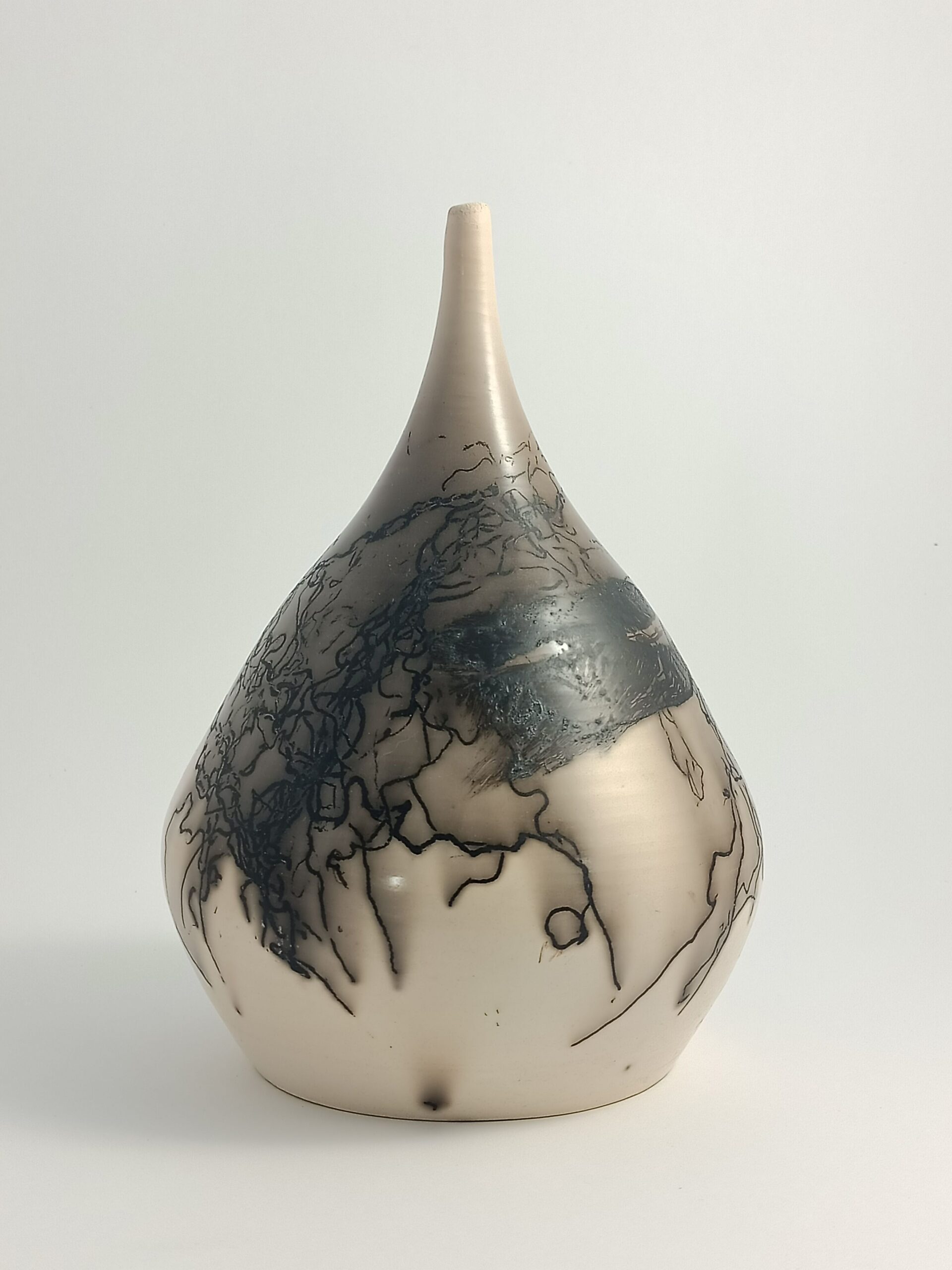 Nowość od Anny Mikody-Antoniewicz – butla wykonana w technice raku z końskim włosem, polerowana i woskowana.