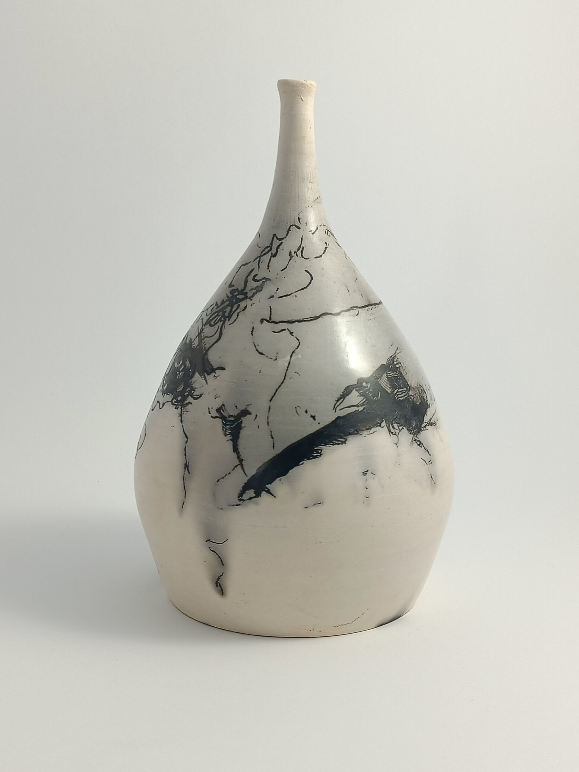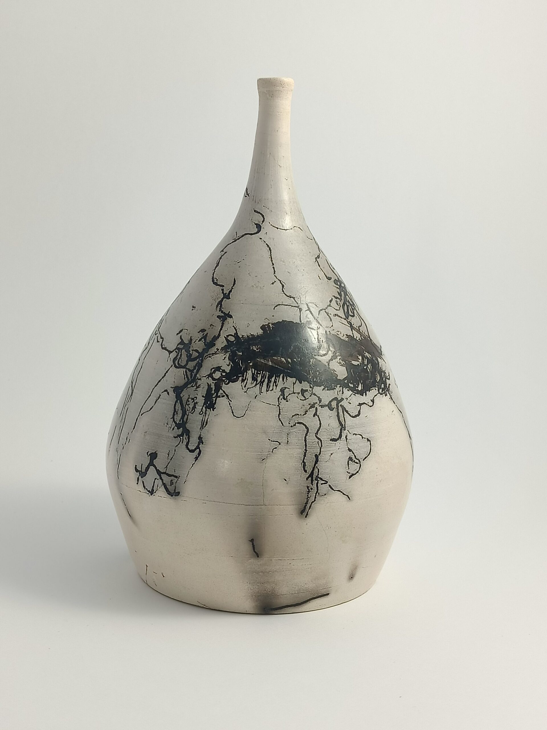 Nowość od Anny Mikody-Antoniewicz – butla wykonana w technice raku z końskim włosem, polerowana i woskowana.
