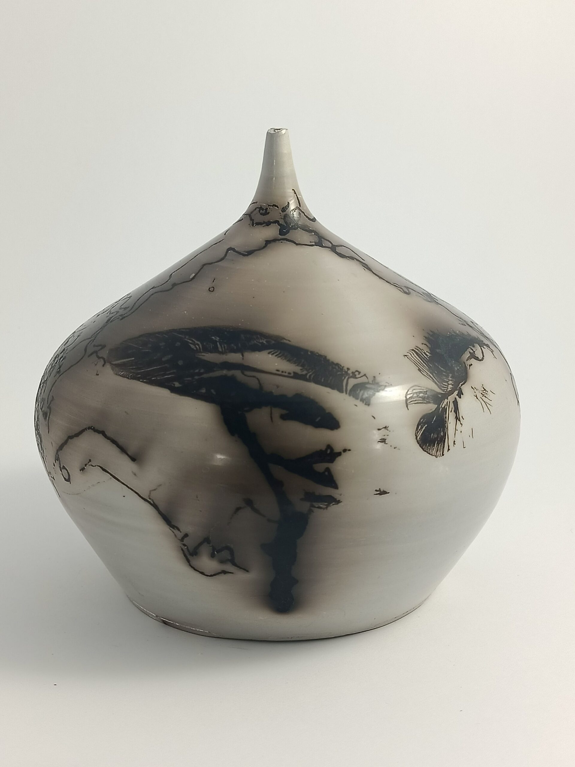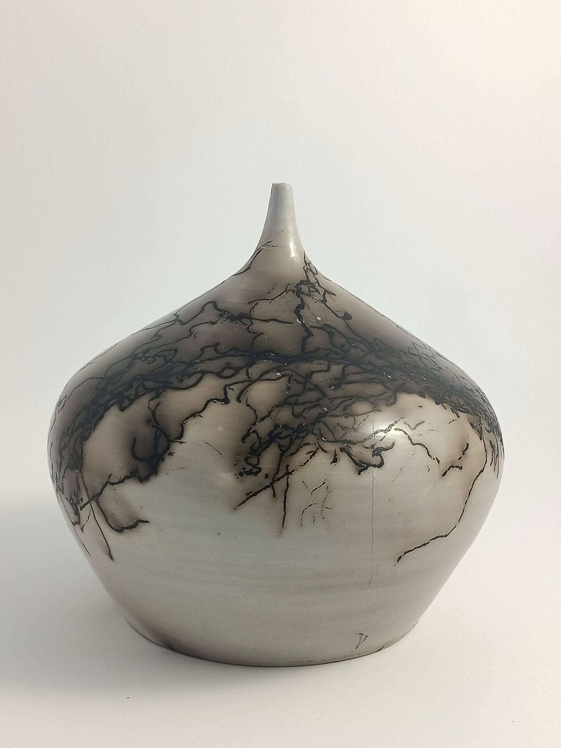 Nowość od Anny Mikody-Antoniewicz – butla wykonana w technice raku z końskim włosem, polerowana i woskowana.