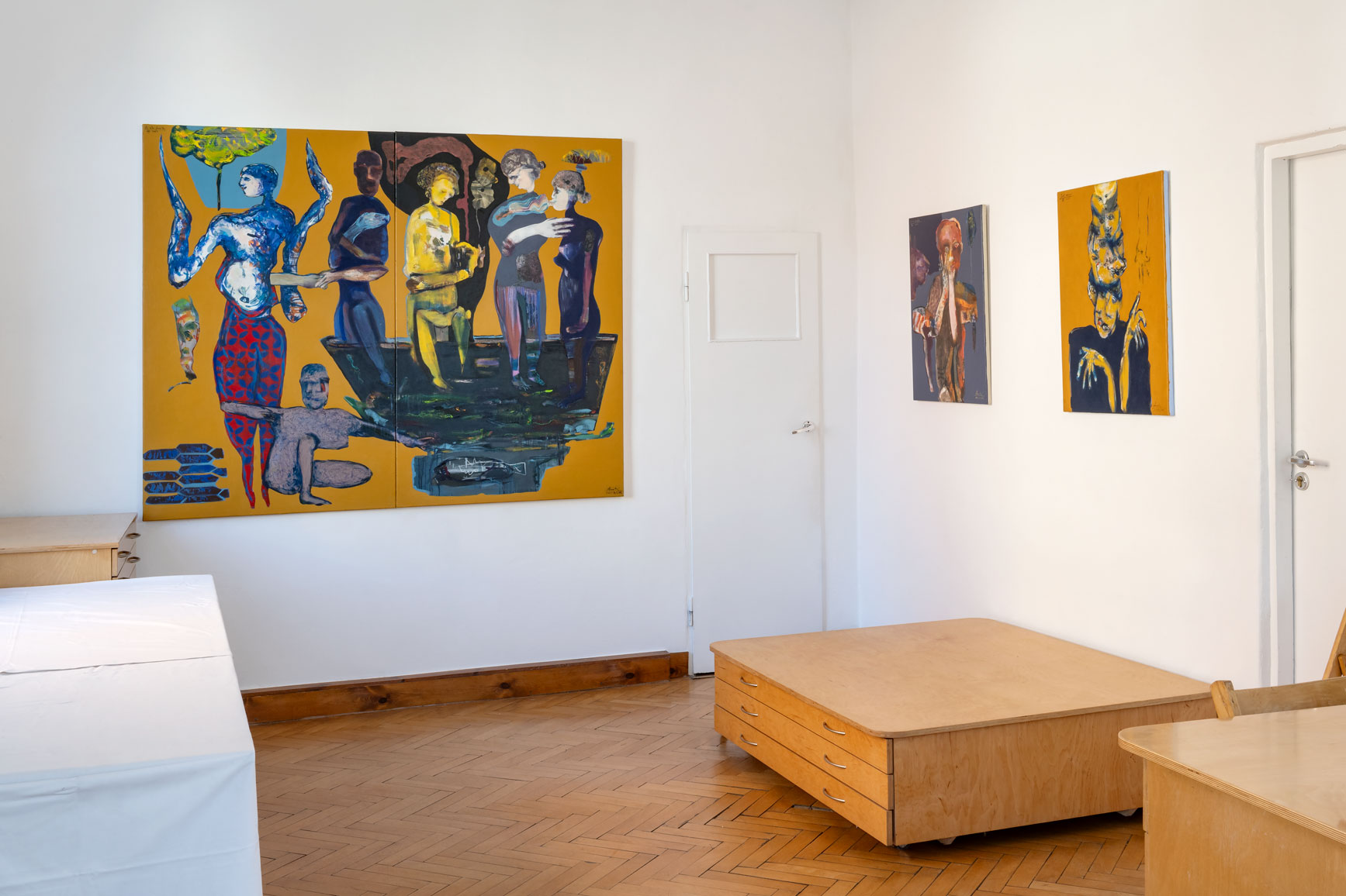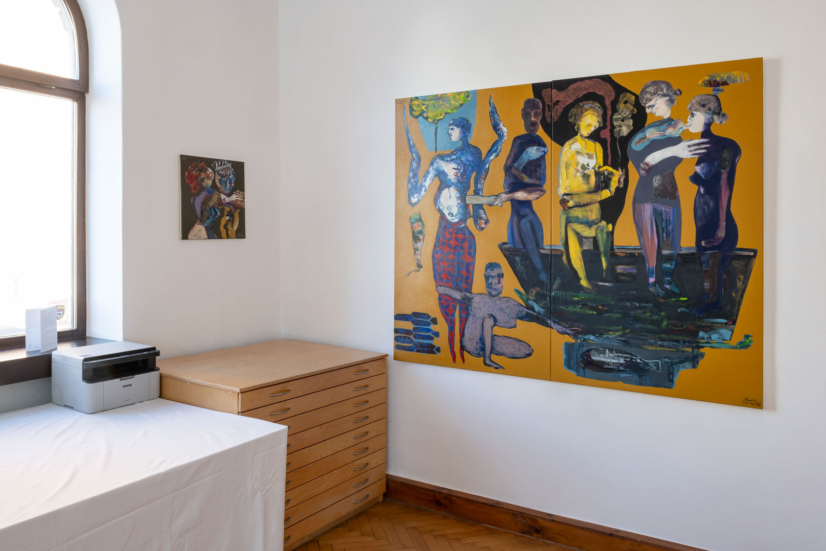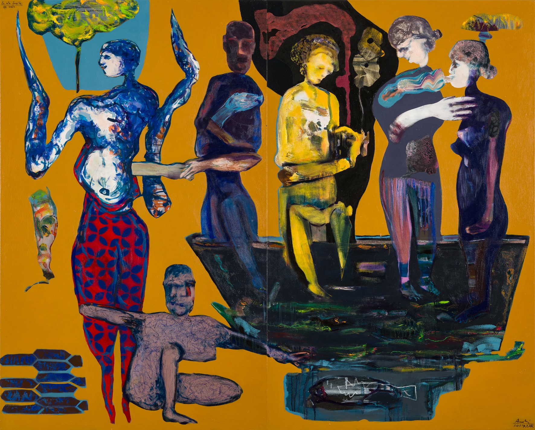 Obraz Andrzeja Kasprzaka prezentowany na wystawie HUMAN GARDEN; wykonany olejem, pastelą i shellakiem na płótnie.