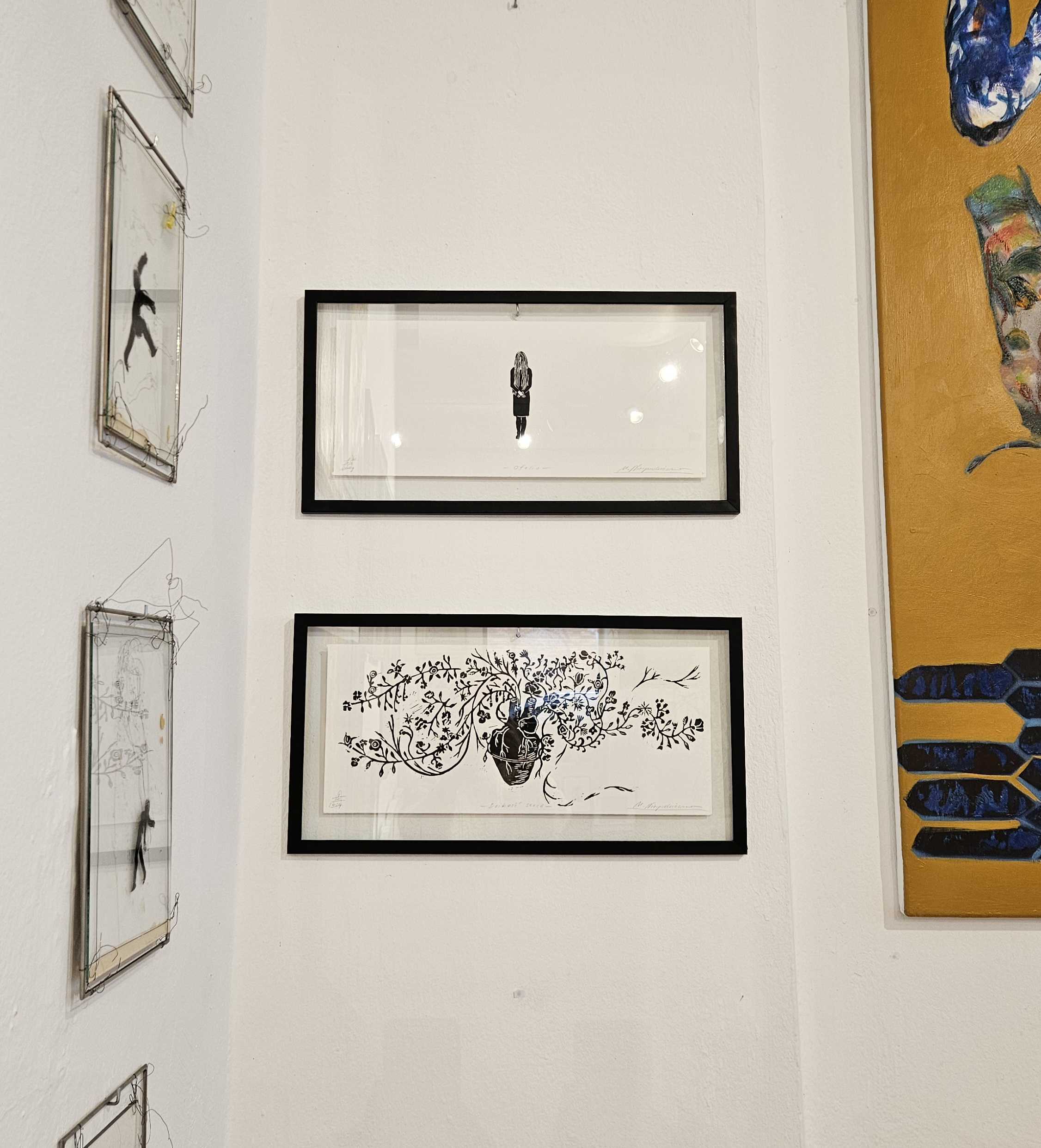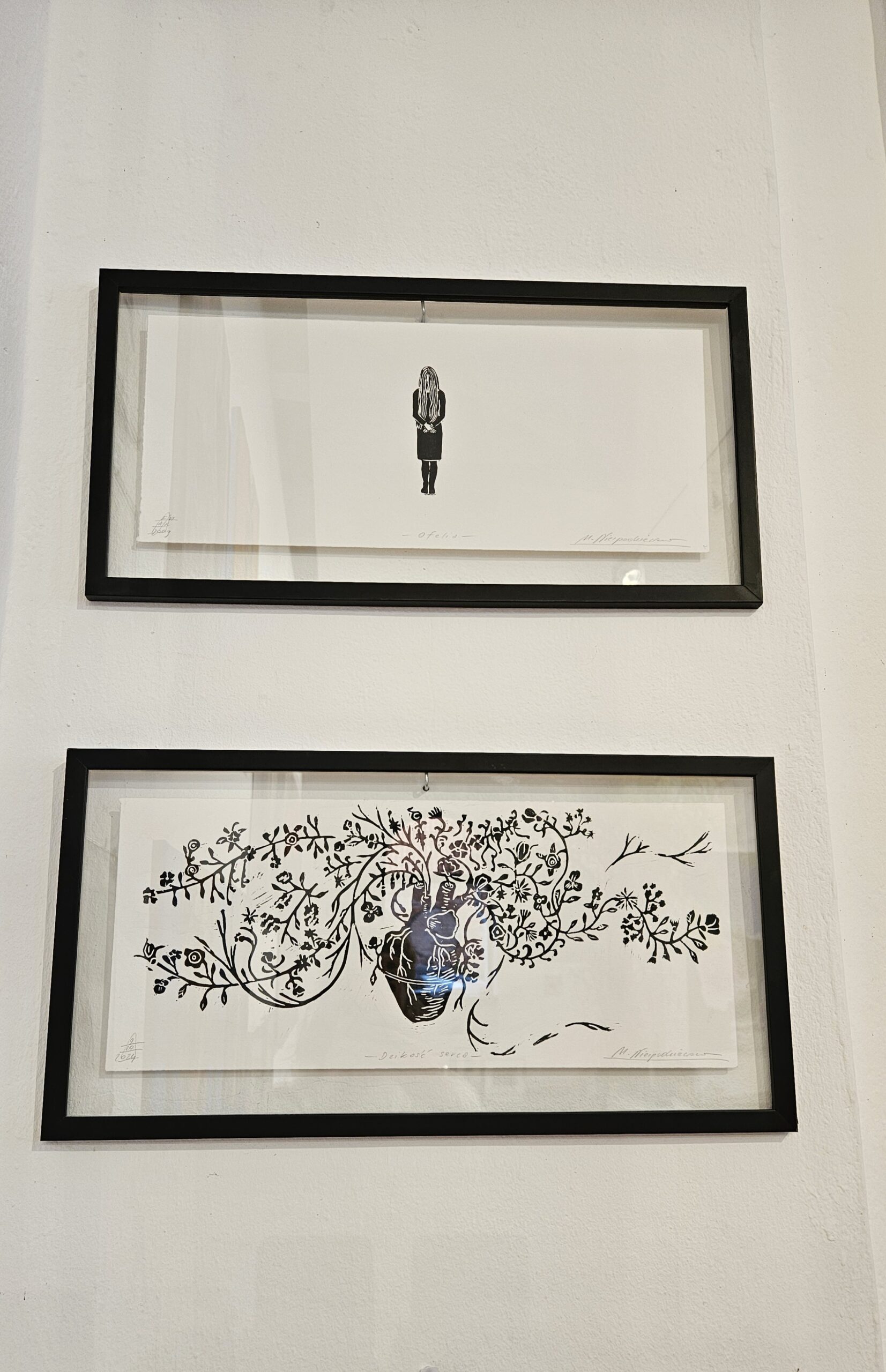 Praca oprawiona jest między dwoma szybami, w cienkiej czarnej ramce. Wymiary ramy to 52,5 x 27,5 cm.