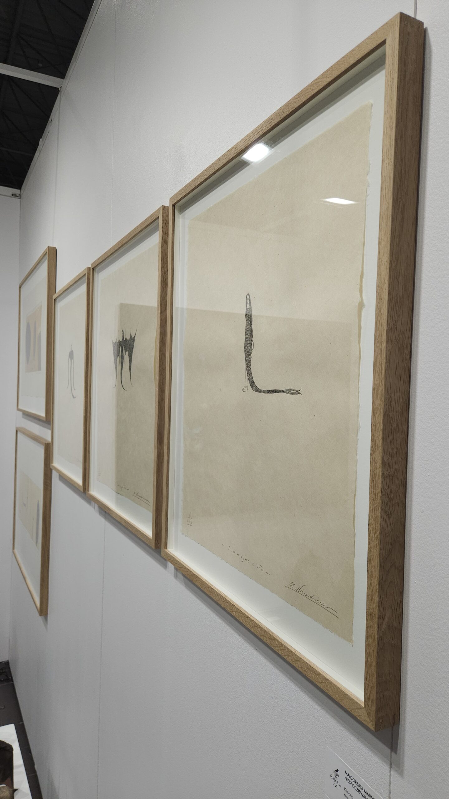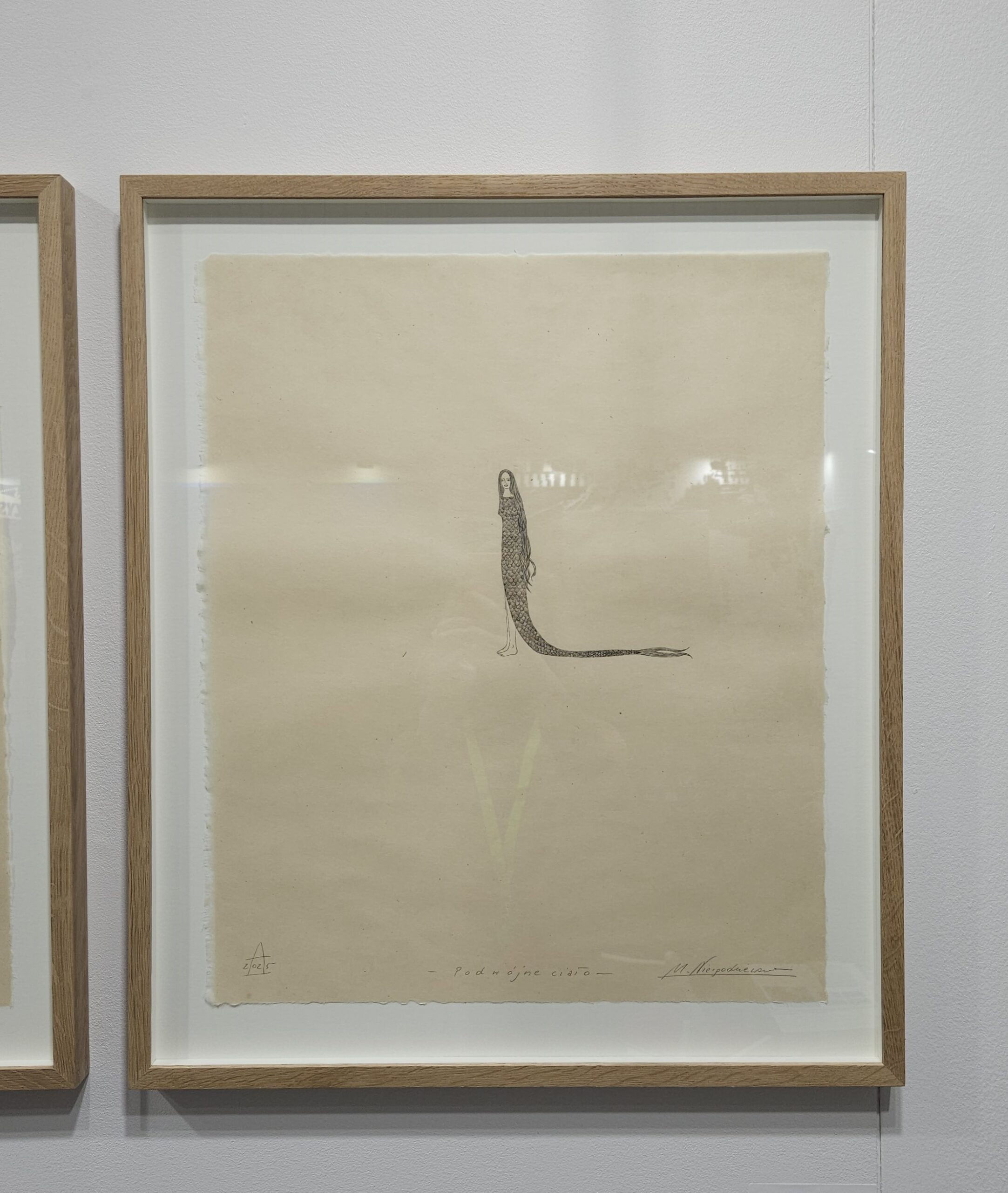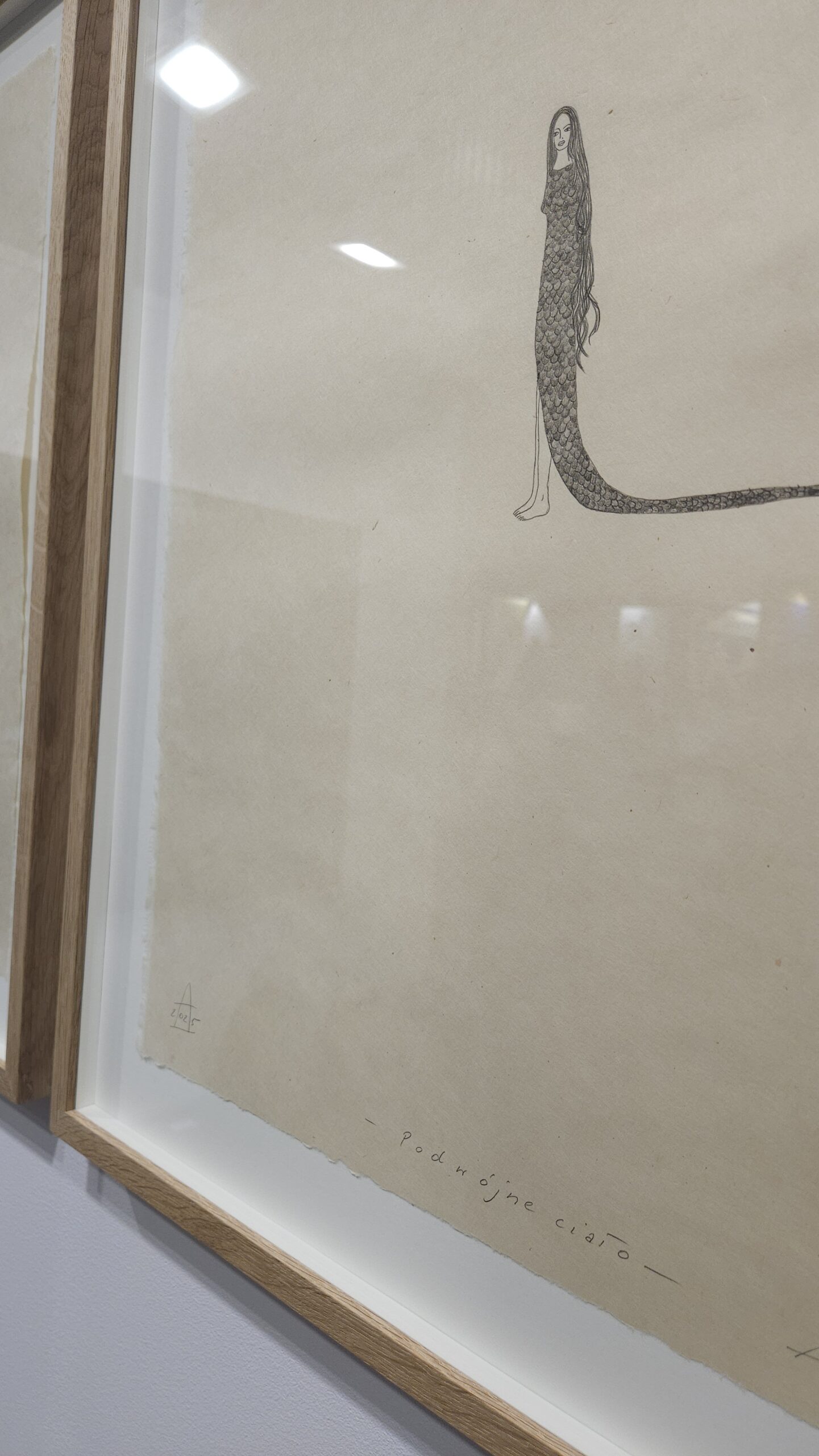 Rysunek wykonany ołówkiem na japońskim papierze. Oprawiony w gablotową dębową ramę w naturalnym kolorze.